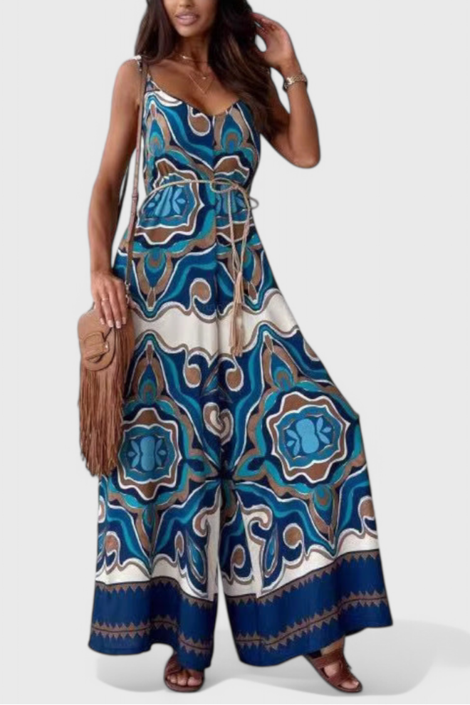 Haz una entrada impactante con Gabriella: un mono fluido de pierna ancha diseñado para captar la atención. Con su favorecedor escote en V, delicados tirantes de espagueti y cinturón que define la cintura, este look combina un estampado audaz con una sofisticación sin esfuerzo. Ideal para escapadas soleadas o planes nocturnos elegantes.