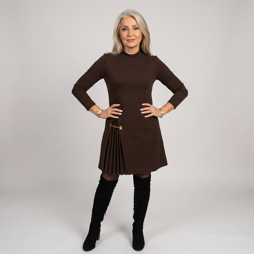 Vestido Sofisticado Línea A con Detalle Plisado y Cadena Dorada